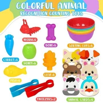 Setul include o varietate impresionanta de piese, menite sa capteze atentia oricarui copil. Veti gasi figurine adorabile de animale, cum ar fi o pisica zambitoare, un soricel curios, un iepuras jucaus, un catel fidel, un ursulet bland, un pinguin simpatic si o vacuta prietenoasa. Fiecare animal vine cu propria sa ‘gura’ sau bol, unde copiii vor aseza hrana potrivita. Pe langa figurinele de animale, setul contine o multitudine de obiecte alimentare viu colorate: pestisori galbeni, morcovi portocalii, viermi rosii, oase violet si frunze verzi. Toate aceste elemente sunt realizate din materiale durabile si non-toxice, perfect sigure pentru mainile mici ale copiilor. Un aspect important este includerea unor pensete special concepute pentru copii, ce faciliteaza prinderea si manipularea obiectelor, contribuind astfel la dezvoltarea dexteritatii si a motricitatii fine.