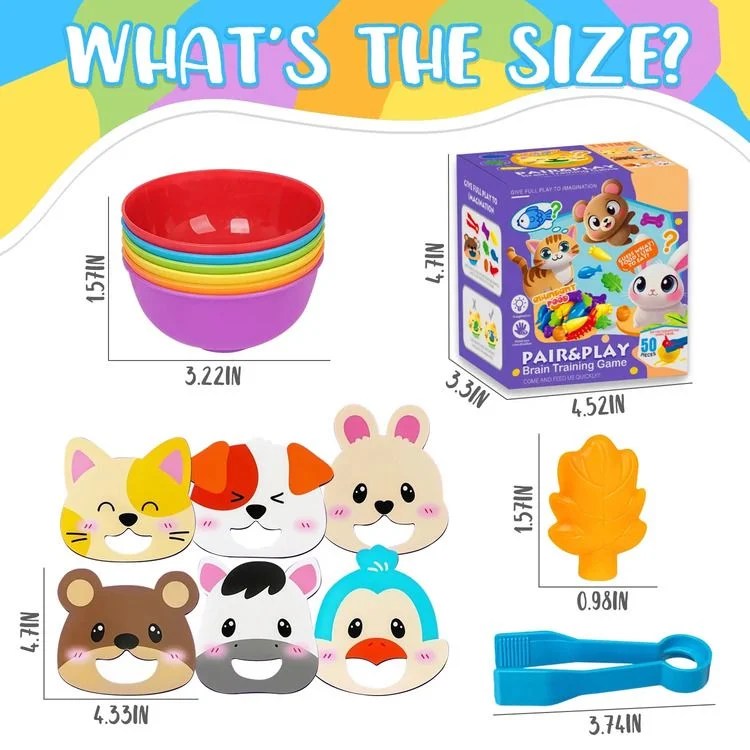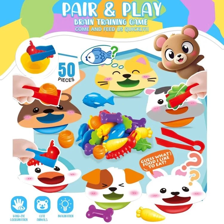PAIR&PLAY este mult mai mult decat un simplu joc; este un instrument didactic eficient. Prin activitatea de potrivire a hranei cu animalele corespunzatoare, copiii isi dezvolta abilitatile cognitive. Ei invata sa recunoasca culorile, formele si tipurile de hrana, dar si sa asocieze logic fiecare aliment cu animalul care il consuma. Spre exemplu, pisica mananca peste, iepurasul mananca morcovi, iar cainele rontaie oase. Aceasta activitate stimuleaza gandirea critica si rezolvarea de probleme. Pe langa aspectele cognitive, motricitatea fina este intens antrenata. Folosirea pensetelor intareste muschii mici ai mainilor, imbunatatind coordonarea mana-ochi si pregatind copilul pentru sarcini mai complexe, precum scrisul sau desenatul. Prinderea si plasarea obiectelor mici necesita precizie si rabdare, calitati esentiale in procesul de invatare.